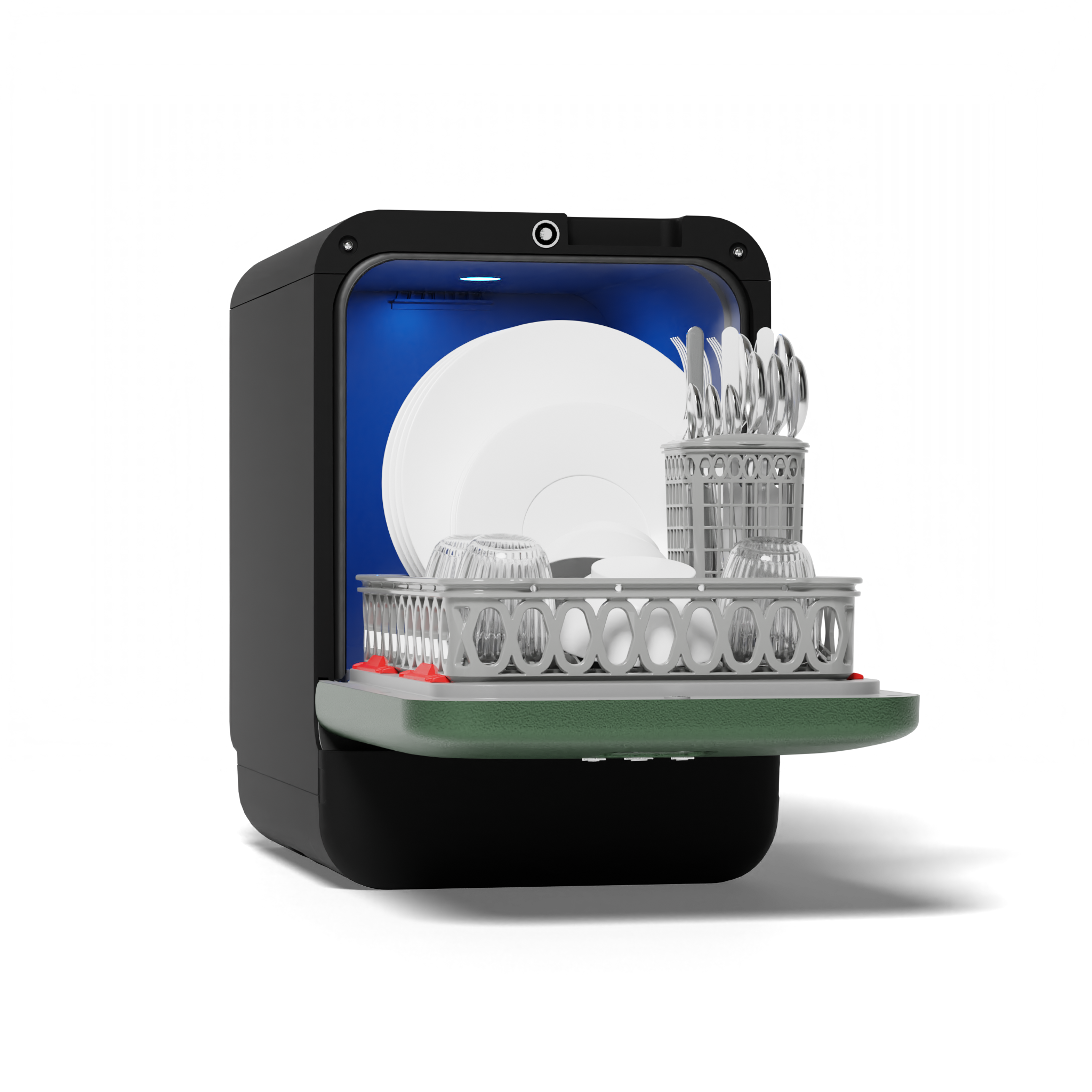 Bob – design eco mini-oppvaskmaskin med front i grønn krom / skrog i svart – dishwasher front chrome green / body black